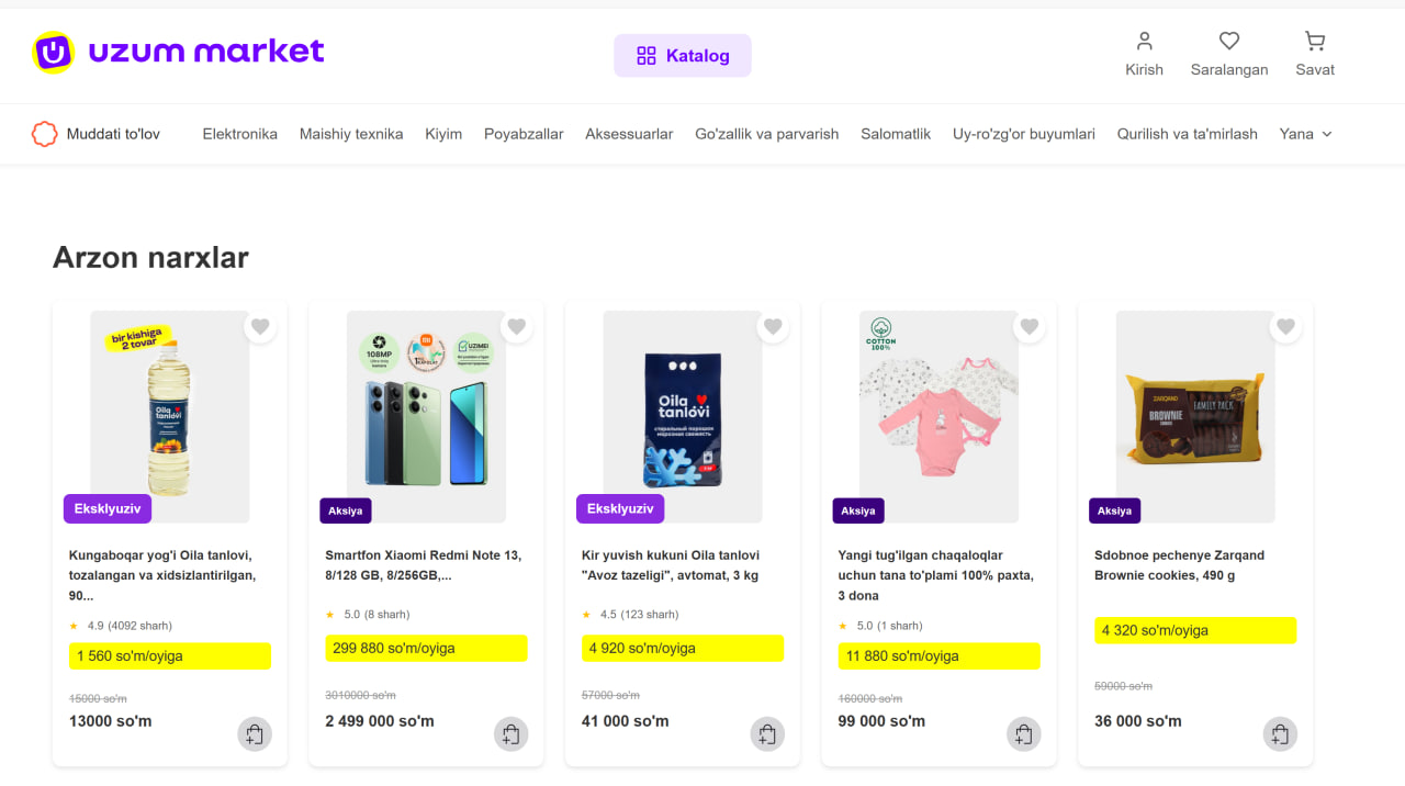 Uzum Market is an online supermarket and delivery service in Uzbekistan that allows users to order groceries and everyday products and have them delivered to their homes.